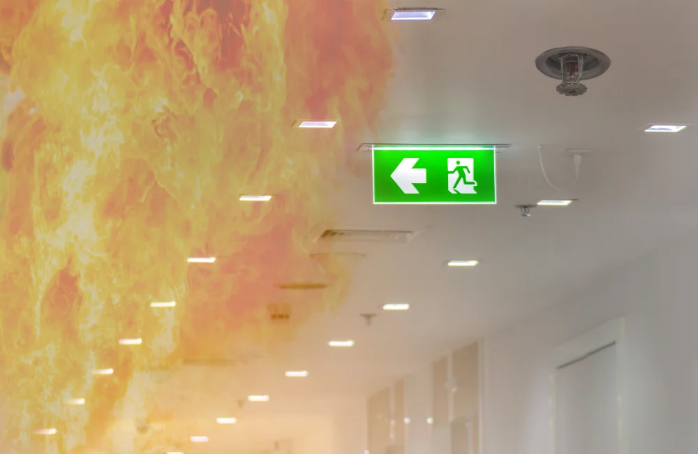 - ป้ายไฟทางออกฉุกเฉิน อุปกรณ์ที่ช่วยบอกเส้นทางหนีไฟในกรณีฉุกเฉิน ควรติดตั้งในตำแหน่งที่มองเห็นได้ชัดเจนและมีแสงสว่างเพียงพอ เพื่อนำทางผู้คนไปสู่จุดปลอดภัย