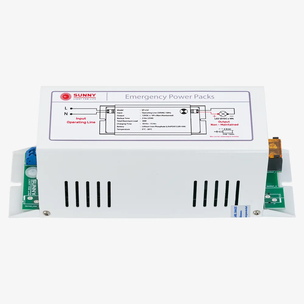 The EP-HS2 emergency power pack with transfer relay is compactly designed, perfect for hidden installations in the ceiling to provide power for emergency lights installed in or under the ceiling. The EP-HS2 power pack is special in that it can supply either a 12 Vdc or 220 Vac power supply. A switch to turn on or off the power pack can be installed at any desired location and it is also equipped with the innovative 3 Steps Charger (patent number 15955) to help extend the operational life of the battery The casing is produced from 1mm thick Electro-Galvanized steel coated with Epoxy powder and special chemicals to prevent any possible rust.